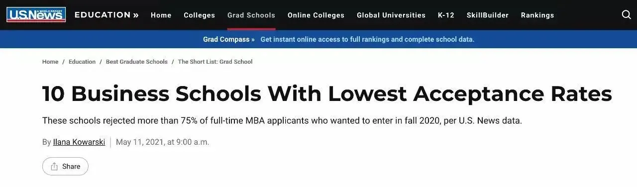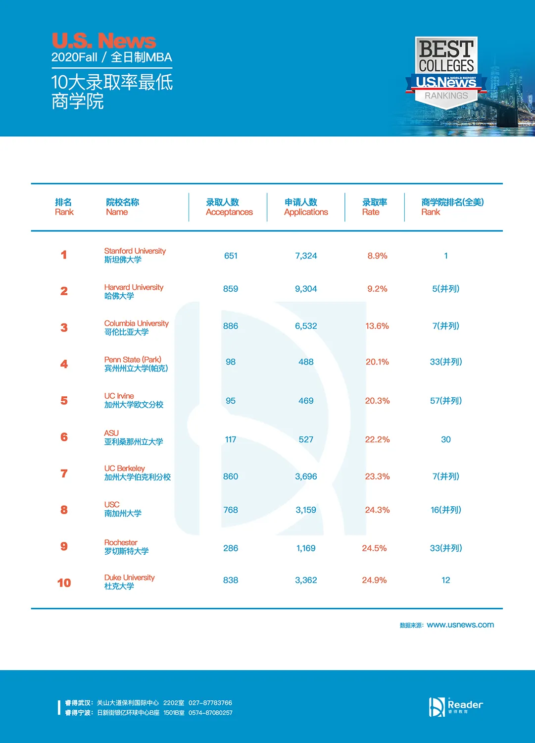本次调查,U.S. News一共对138个全日制MBA项目进行了调查,它们的2020年秋季的平均录取率约为58.9%,而上表所列的10所院校的平均比率仅为19.1%。